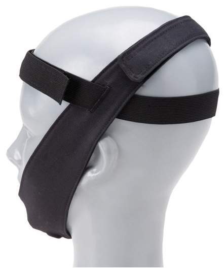 - Das Band wird unterhalb des Kinns angelegt und über den Kopf geführt.
