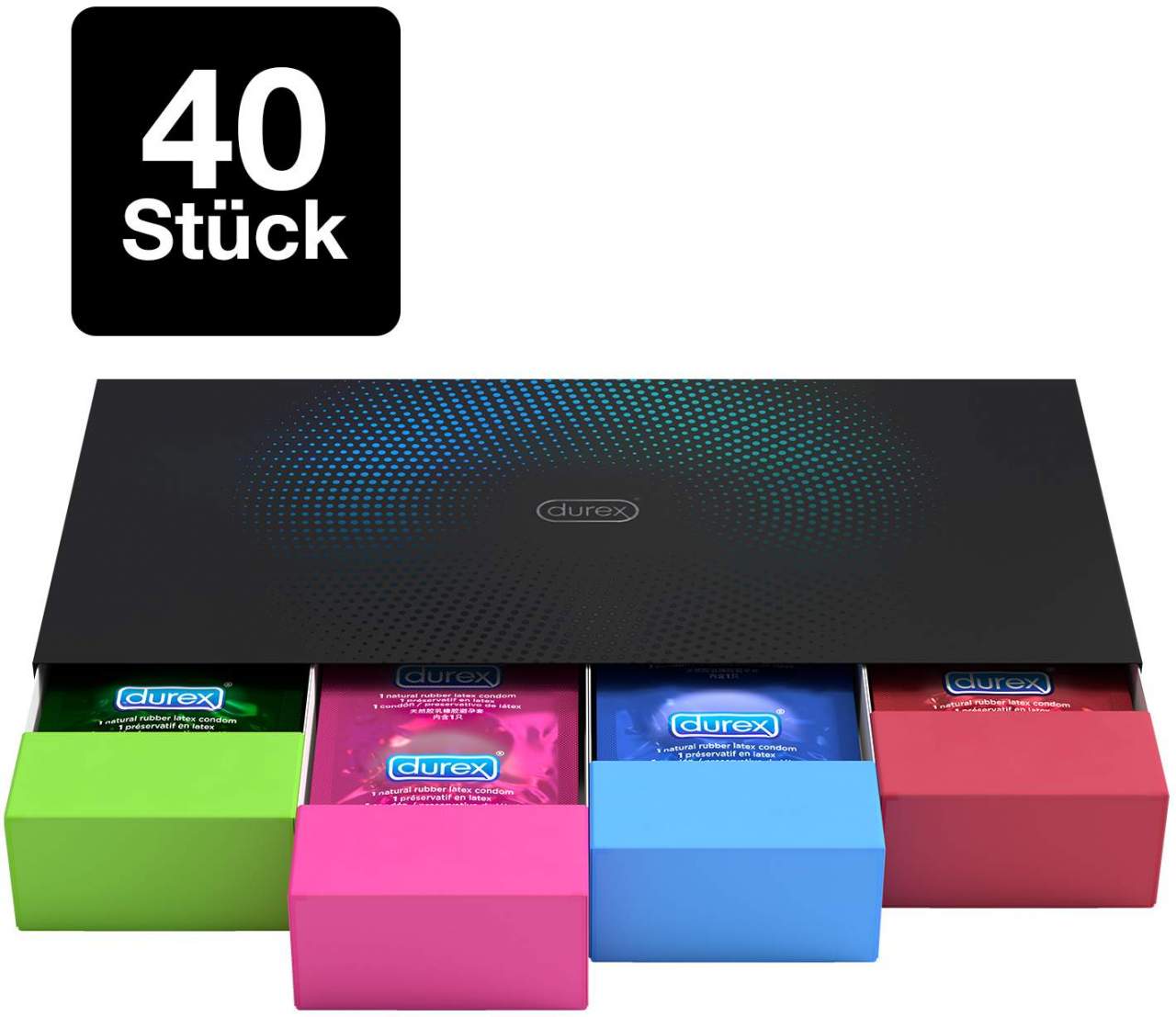 Die Durex Surprise Me Box enthält eine bunte Mischung aus vier verschiedenen Durex Kondomsorten, jeweils 10 Stück, sodass du für jede Stimmung und jeden Wunsch das passende Kondom parat hast. Jede Sorte bietet ein einzigartiges Erlebnis und sorgt für unvergessliche Momente.
