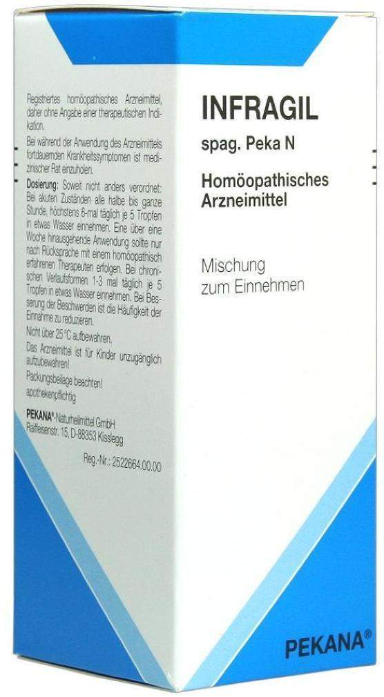 Bitte lesen Sie vor der Anwendung von Infragil Spag. Peka N sorgfältig die Packungsbeilage und fragen Sie Ihren Arzt oder Apotheker, wenn Sie weitere Fragen haben. Infragil Spag. Peka N ist ein registriertes homöopathisches Arzneimittel, daher ohne Angabe einer therapeutischen Indikation. Bei während der Anwendung fortdauernden Krankheitssymptomen bitte medizinischen Rat einholen. Enthält 48 Vol.-% Alkohol.