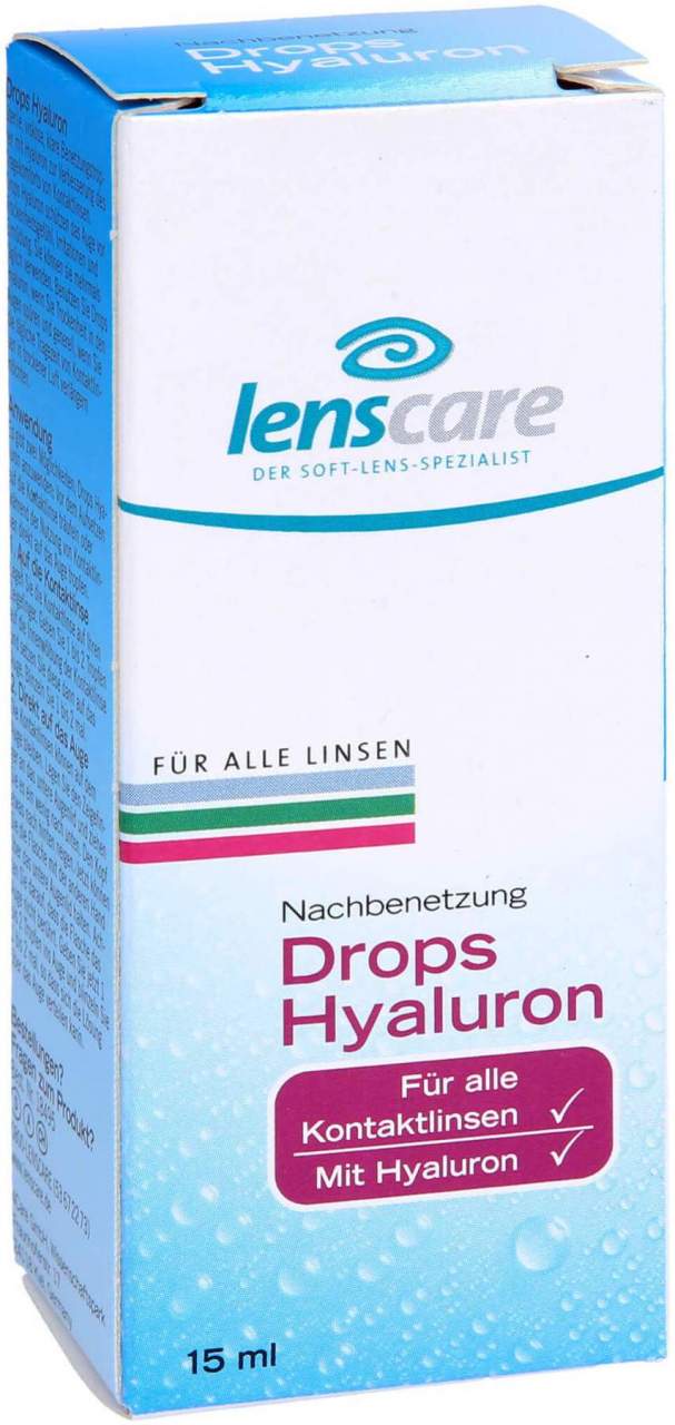 - Tropfe 1-2 Tropfen Lenscare Drops Hyaluron in den Bindehautsack.