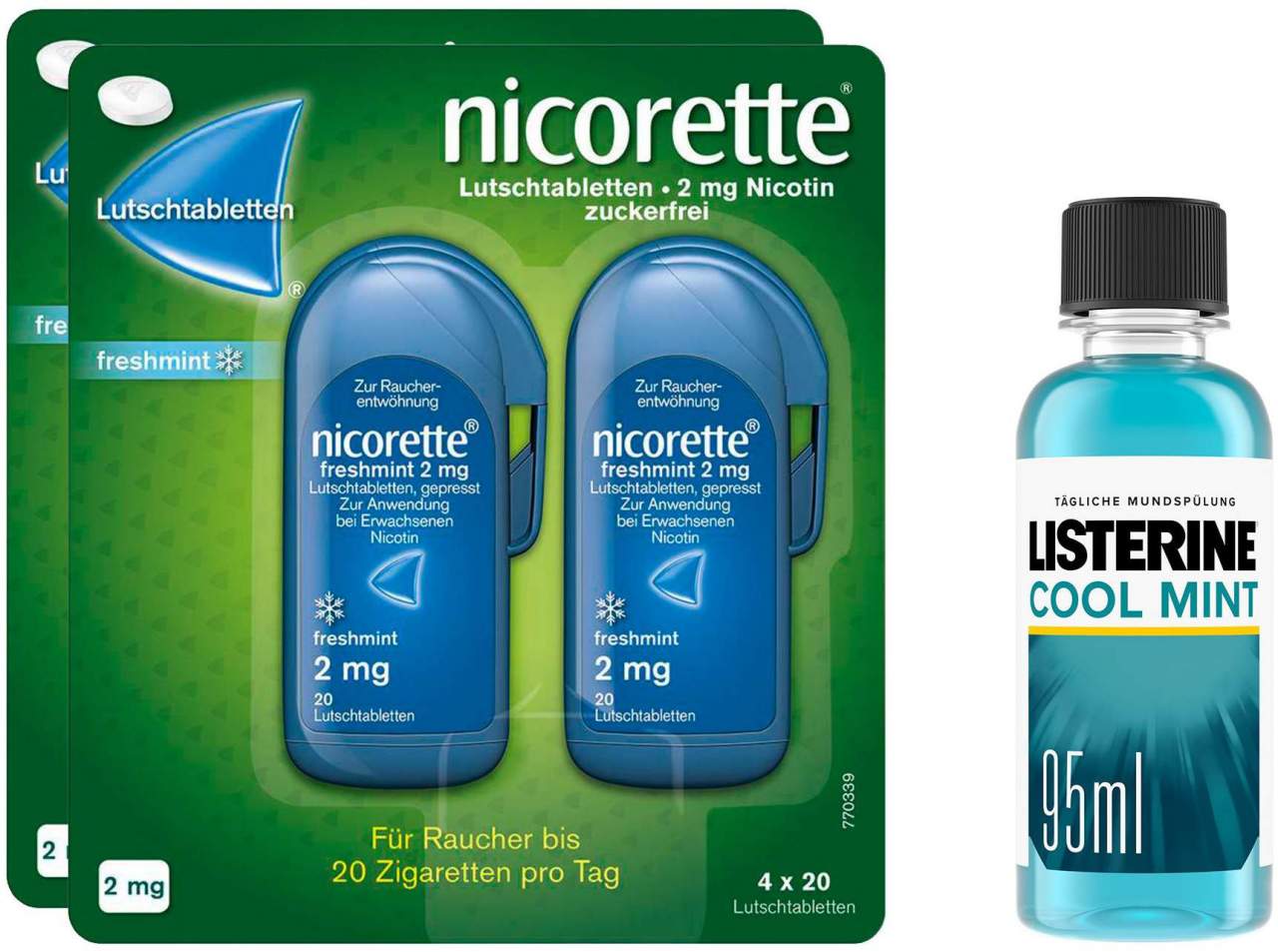 Warten Sie nicht länger! Bestellen Sie jetzt Nicorette Freshmint 2 mg Lutschtabletten im Doppelpack und erhalten Sie eine gratis Flasche Listerine Cool Mint 95 ml dazu. Nutzen Sie diese Chance, um endlich mit dem Rauchen aufzuhören und ein gesünderes, glücklicheres Leben zu führen. Wir unterstützen Sie auf Ihrem Weg zum Rauchstopp!